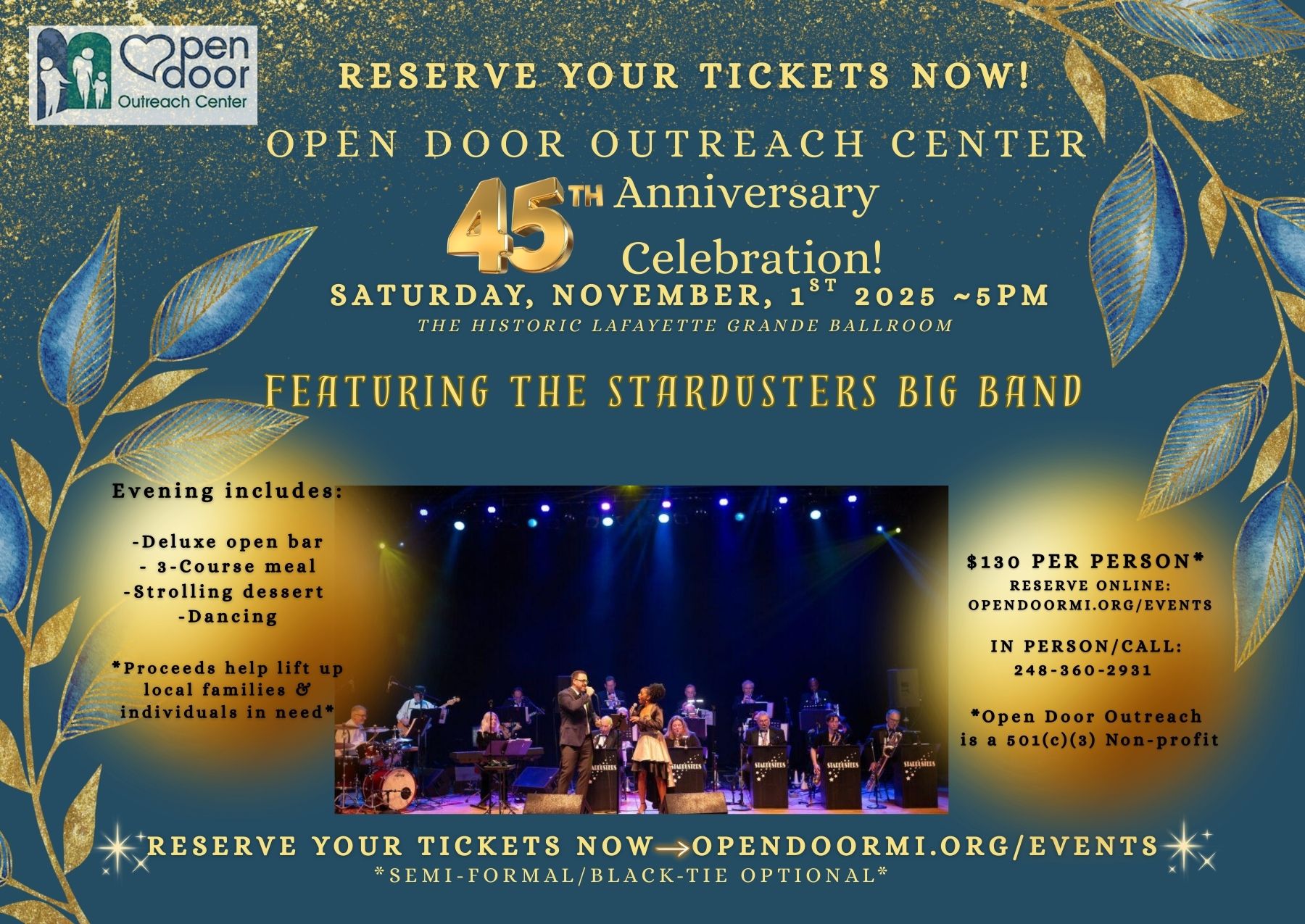 Join our Open Door Outreach Center to celebrate 45 years of serving our beautiful community and Neighbor Helping Neighbor!  This elegant evening will feature the STARDUSTERS BIG BAND at the historic Lafayette Grande Ballroom.  This black Tie optional celebration event will include decadent food and desserts, cocktails, good friends, fun, and dancing to celebrate our 45 years of serving Oakland County!  Please mark your calendars and join us.  RESERVE your tickets NOW  or call our Administrative offices at 248-360-2931 x 6 to pay by phone or in person.